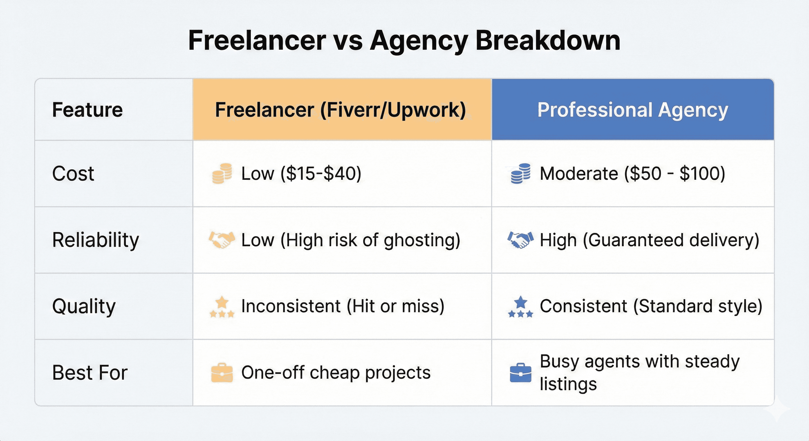 Most top agents learn this the hard way after missing a listing deadline because a freelancer ghosted them.